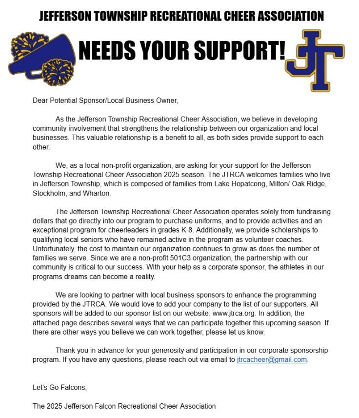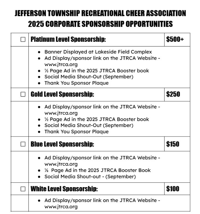 Please email us at JTRCAcheer@gmail.com if you are interested in sponsoring our program!